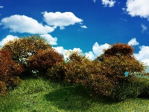clouds, Bush, lonely, Meadow, trees