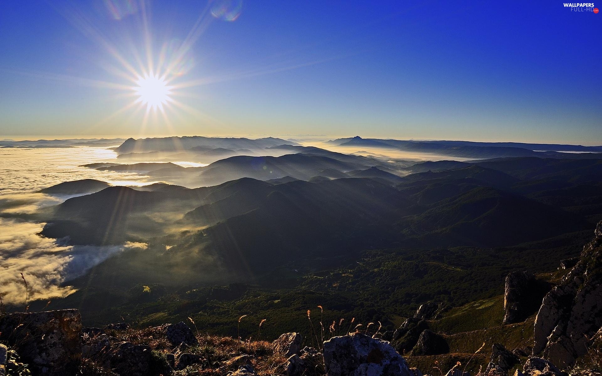 clouds, Mountains, east, rocks, sun