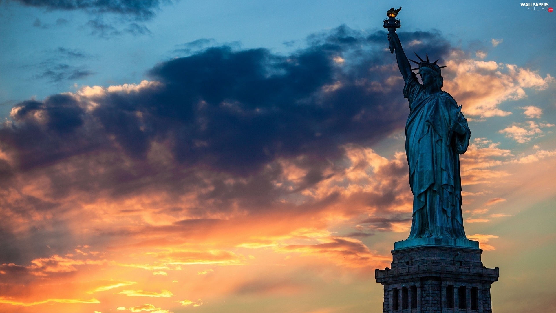 Przebijaj?ce, ligh, sun, luminosity, flash, statue, freedom, USA, clouds