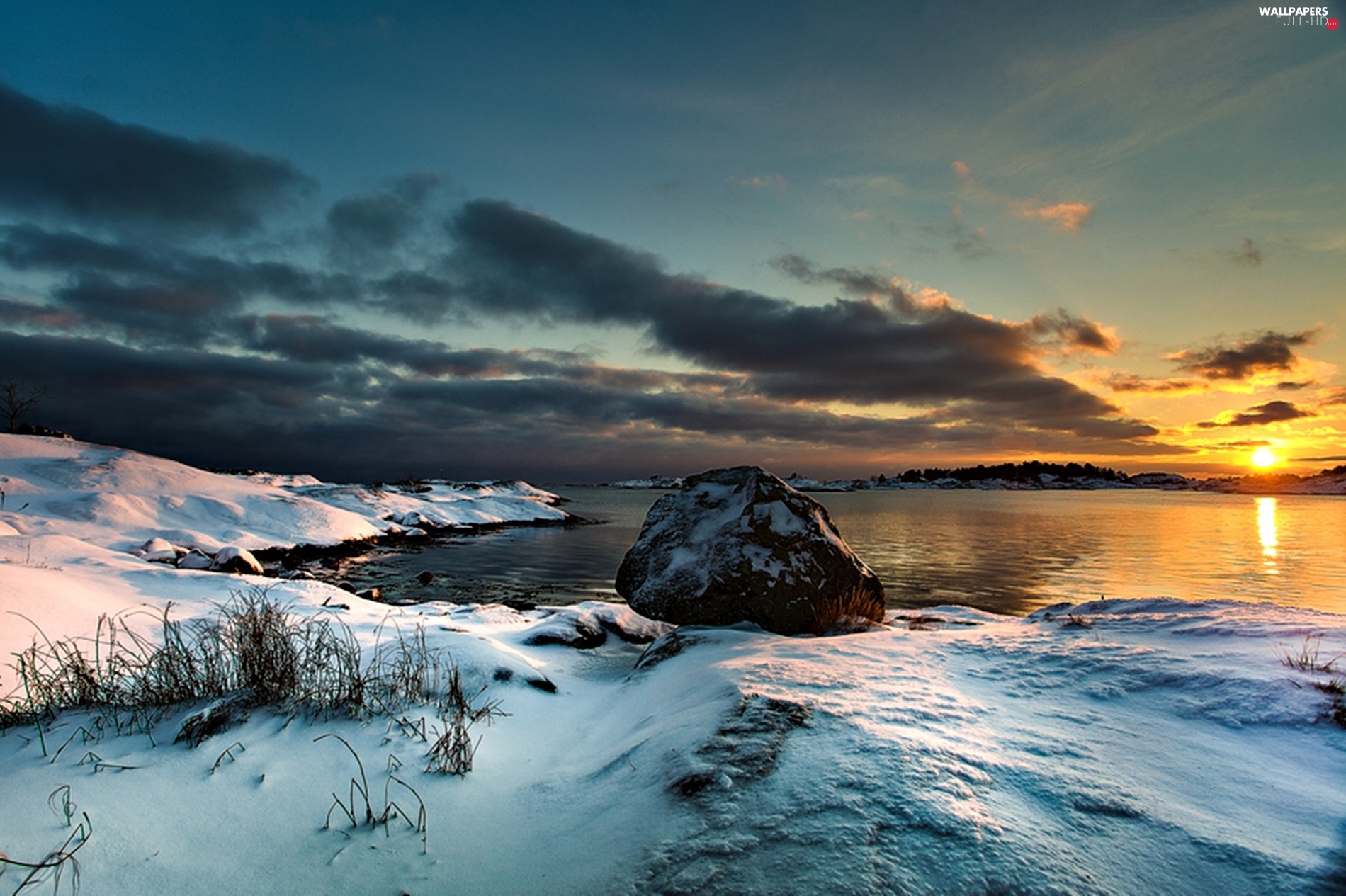 snow, sea, west, clouds, sun