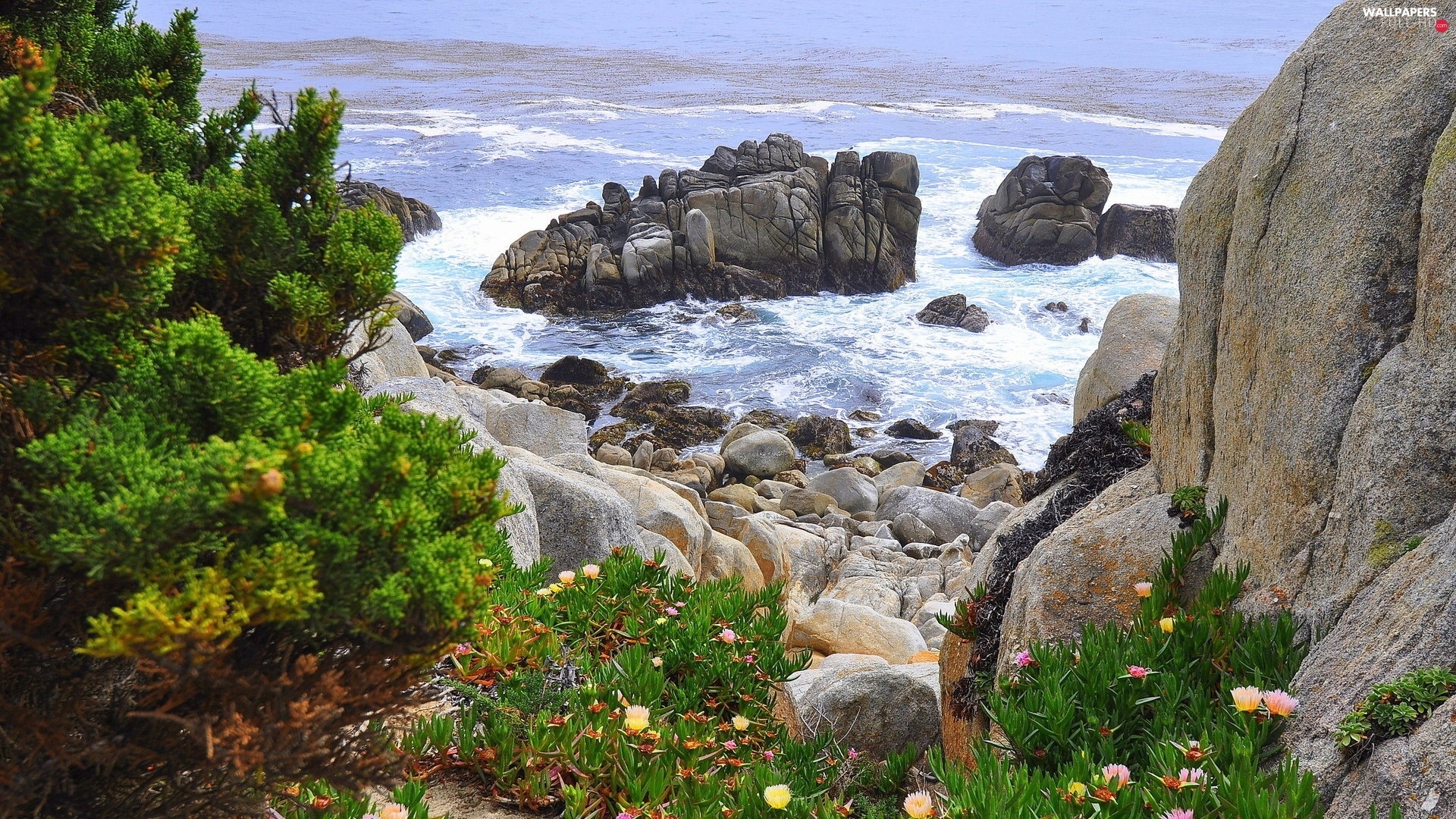 Stones, rocks, sea, Bush, Waves